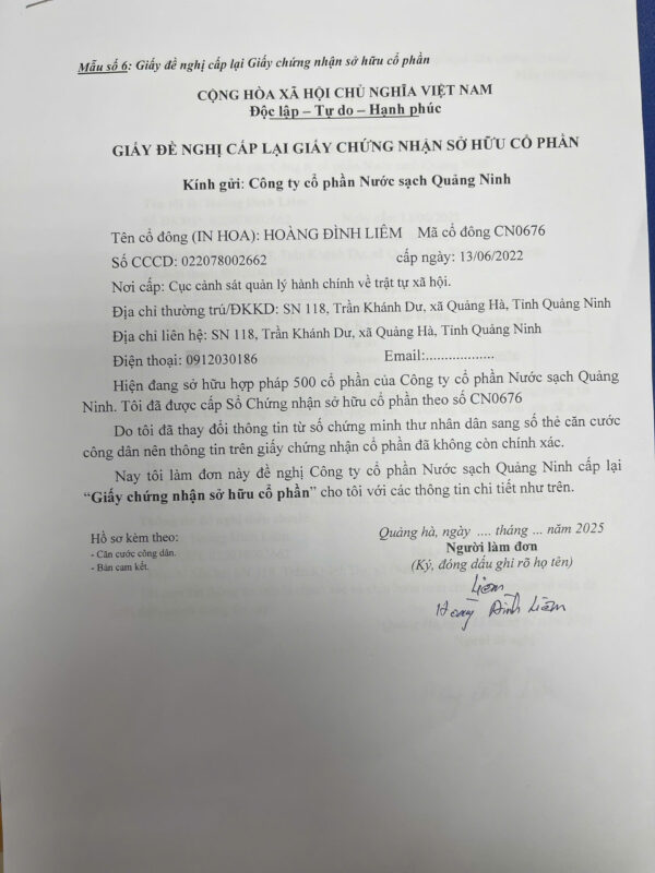 Công ty cổ phần Nước sạch Quảng Ninh xin công bố Giấy đề nghị cấp lại giấy chứng nhận sở hữu cổ phần của cổ đông Hoàng Đình Liêm trên website https://quawaco.com.vn. Trong thời hạn 07 ngày kể từ ngày công bố lên website, quý cổ đông nào có khiếu nại về giấy đề nghị xin gửi phản hồi về công ty qua số điện thoại 0365 593 706 ( ông Phạm Duy Hiếu)
