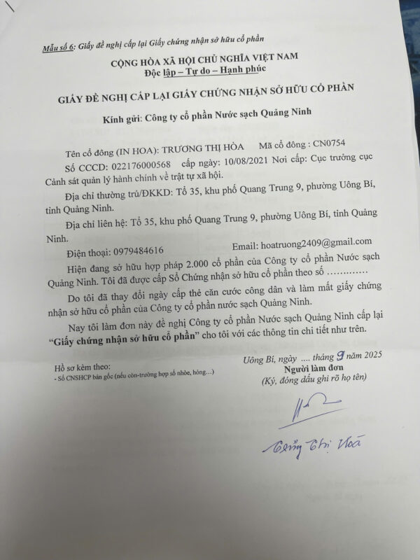 Công ty cổ phần Nước sạch Quảng Ninh xin công bố Giấy đề nghị cấp lại giấy chứng nhận sở hữu cổ phần của cổ đông Trương Thị Hoà trên website https://quawaco.com.vn. Trong thời hạn 07 ngày kể từ ngày công bố lên website, quý cổ đông nào có khiếu nại về giấy đề nghị xin gửi phản hồi về công ty qua số điện thoại 0365 593 706 ( ông Phạm Duy Hiếu)